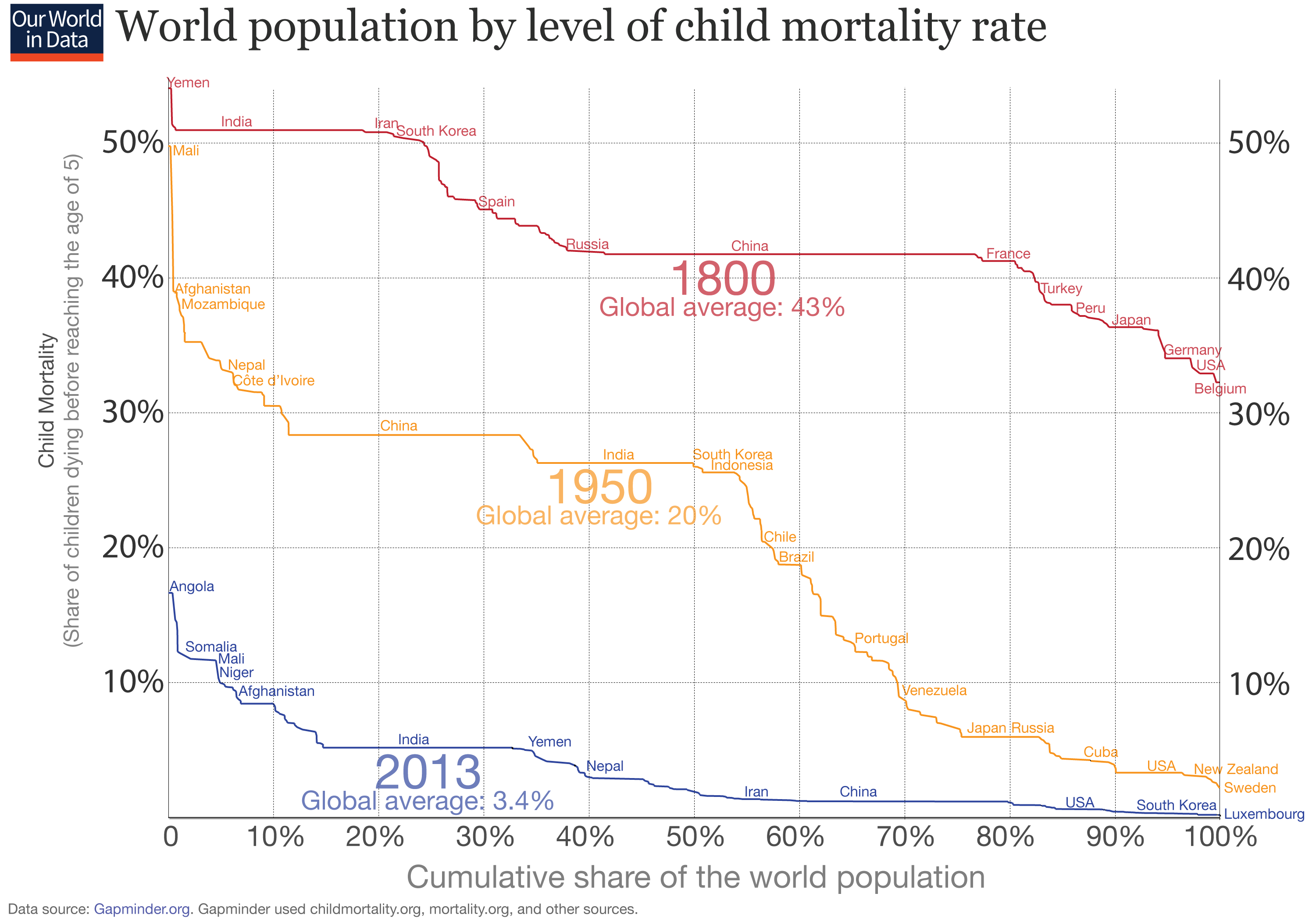 "In 1800, 43% of the world's population died as children. By 1950 it was down to 20%. By 2013 it was down to 3.4%. This is a big win!"